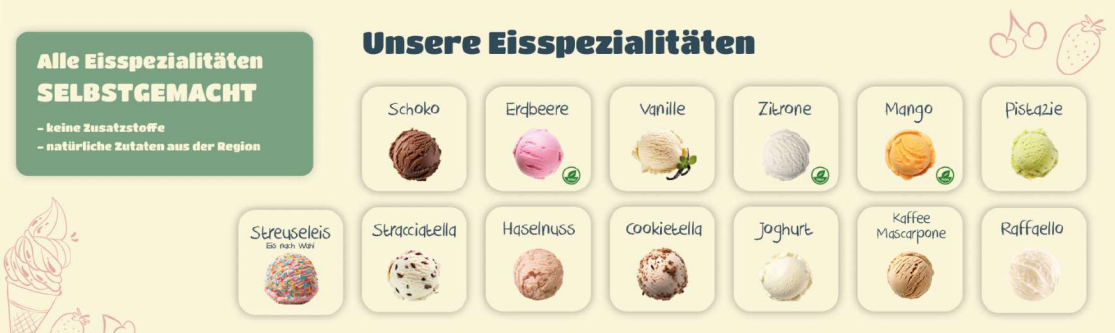 Wir bieten 12 verschiedene Eissorten an, inklusive veganer und laktosefreier Optionen – für jeden Geschmack ist etwas dabei!